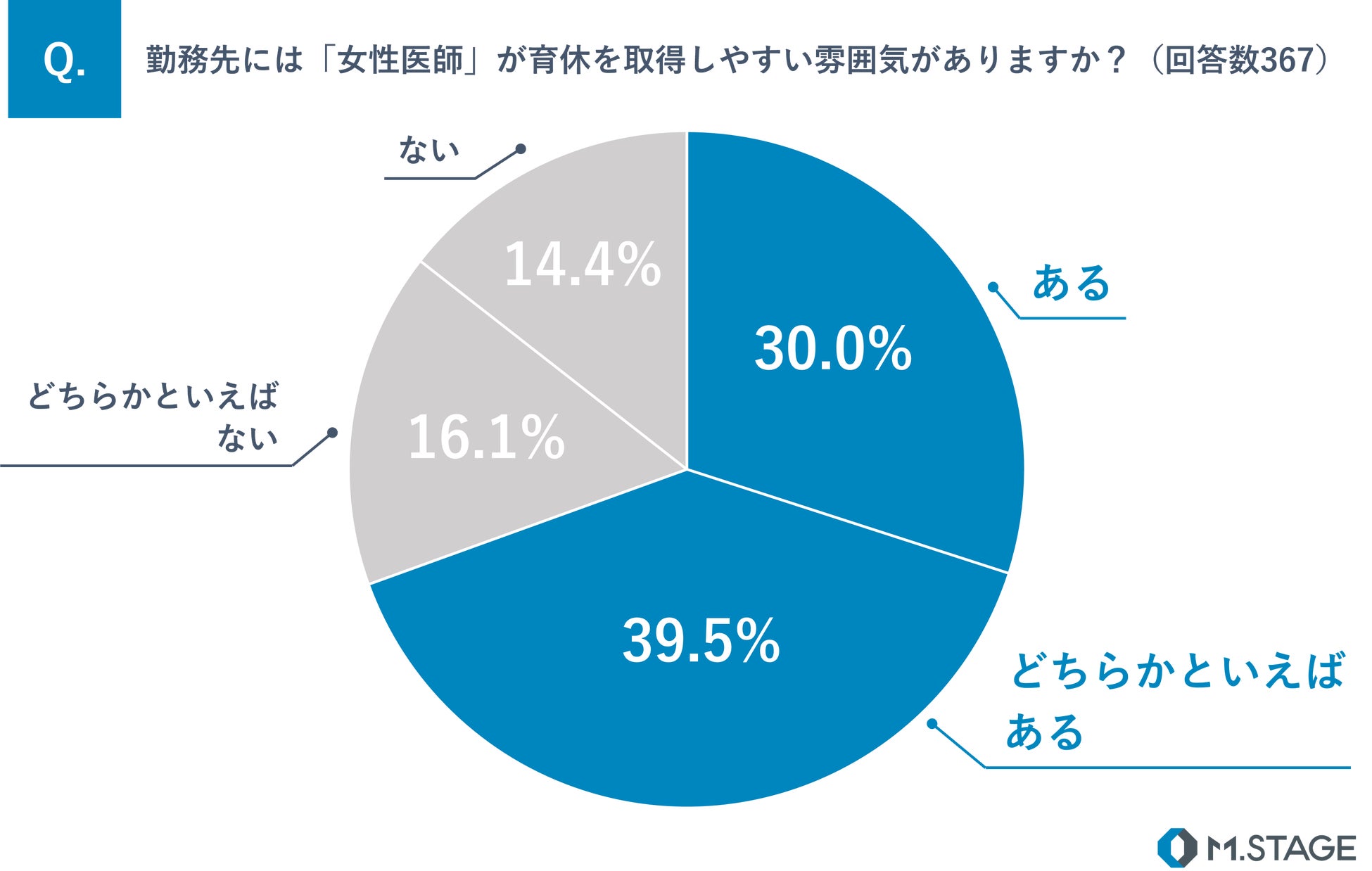一方、女性が育休を取得しやすい雰囲気が「ある」と回答した医師は 30.0%、「どちらかといえばある」と回答した医師は 39.5%となり、約 7 割が勤務先で「女性育休」を取得しやすい雰囲気があるという結果となりました。この結果から男性の育休と女性の育休との間に、「取得しやすい雰囲気」という点で大きな違いがあることがわかりました。