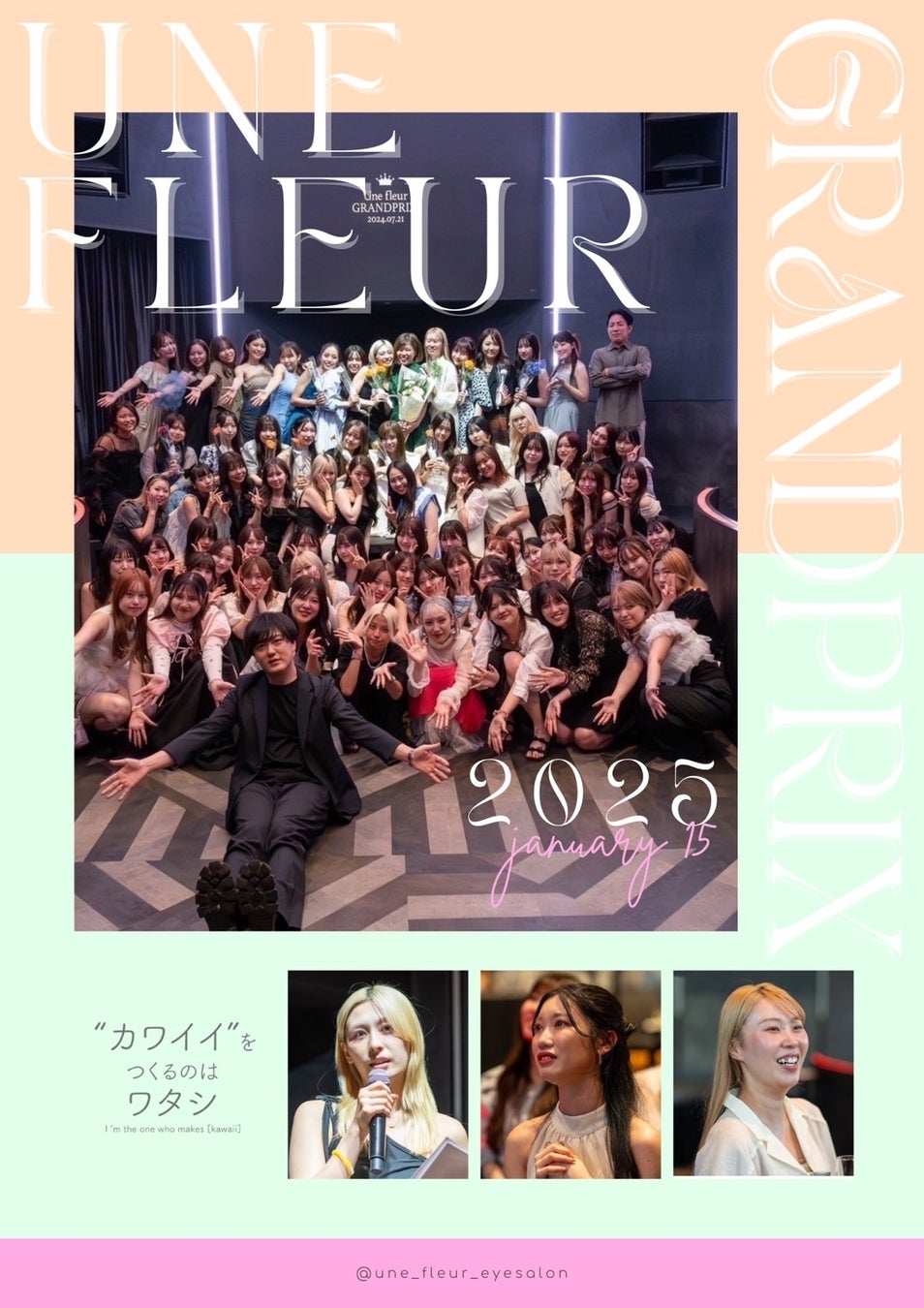Une fleur Grandprixは、入社して間もないアイリストをはじめ、店長も参加しており、店舗や世代の交流だけでなく、技術指導の場も設け、アイリストとしてコンペへの意欲や日頃のサロンワークに活かせる機会となっています。