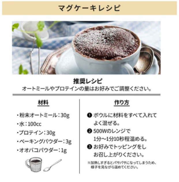 マグケーキにしたときにあんバターの風味をしっかりとお楽しみいただけるように味にこだわって作りました。マグケーキとしてだけでなく、水や牛乳・豆乳と割っても美味しくお召し上がりいただけます。