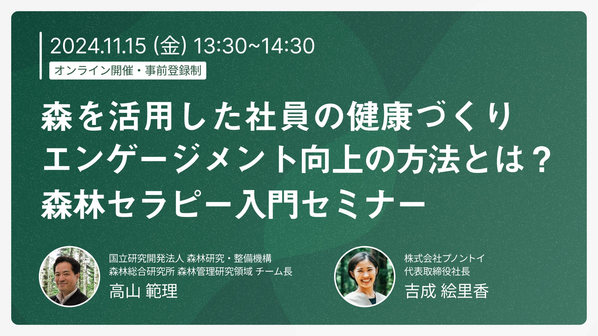 また、本体験会開催に先駆けて、森林浴のストレス低減効果研究の専門家である高山範理氏を講師に招き、「森を活用した社員の健康づくり エンゲージメント向上の方法とは?森林セラピー入門セミナー」を11月15日(金)にオンラインで開催します。