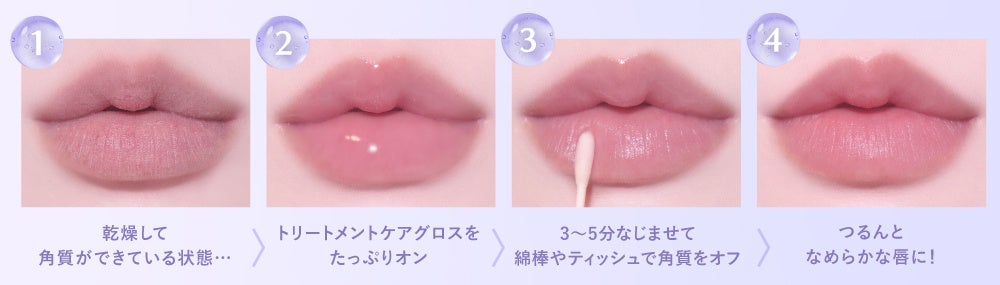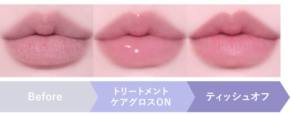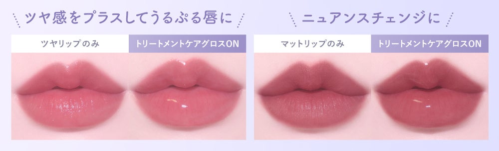 皮むけケア※・リップベース・リップグロス・ボリュームアップ※・ナイトケアとしてマルチに使えるトリートメントケアグロスがWEB限定で新登場。冬の乾燥や皮むけでダメージを受けた唇をたっぷりのうるおいで保湿し、24Hメンテナンスケア。毎日のリップメイク前の保湿や、乾燥・皮むけが気になった際に使用することで、ガサガサ唇をなめらかに整え、水分たっぷりのちゅるんとしたうるぷる唇に仕上げます。