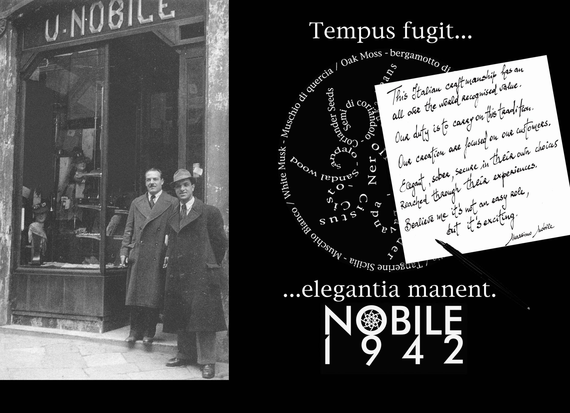 第二次世界大戦最中の1942年、ウンベルト・ノービレがローマで香水ビジネスを始めたのが「ノービレ1942(NOBILE 1942)」の始まり。その後ファミリーである、マッシモとパトリツィオが情熱を受け継ぎ、世界に誇れる“メイド・イン・イタリ―”の魂を胸に、最高品質のフレグランスへのこだわりを持ち続けています。