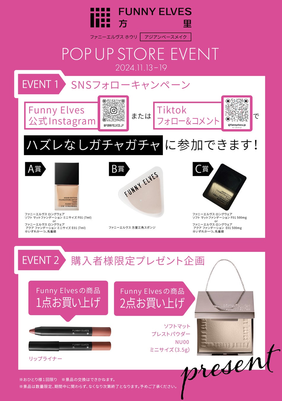 中国発のベースメイクブランド「FUNNY ELVES方里(ファニーエルヴス ホウリ)」(代表取締役社長:楊菊、本社:浙江省杭州市濱江區西興街道聚工路19号8号館15階1512号室)は、2024年11月13日(水)〜11月19日(火)の期間、@cosme OSAKAにて初のPOP UP イベントを開催いたします。