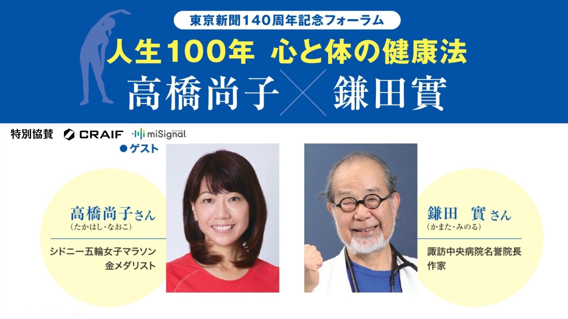Craif株式会社(所在地:東京都文京区、CEO:小野瀨 隆一、以下Craif)は東京新聞140周年記念フォーラム「人生100年 心と体の健康法 高橋尚子×鎌田實」に特別協賛いたしました。