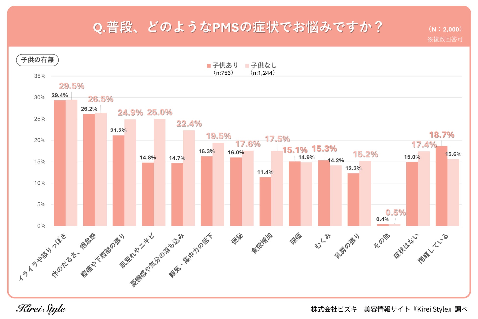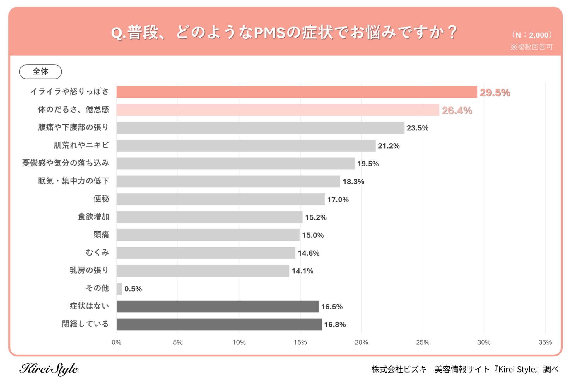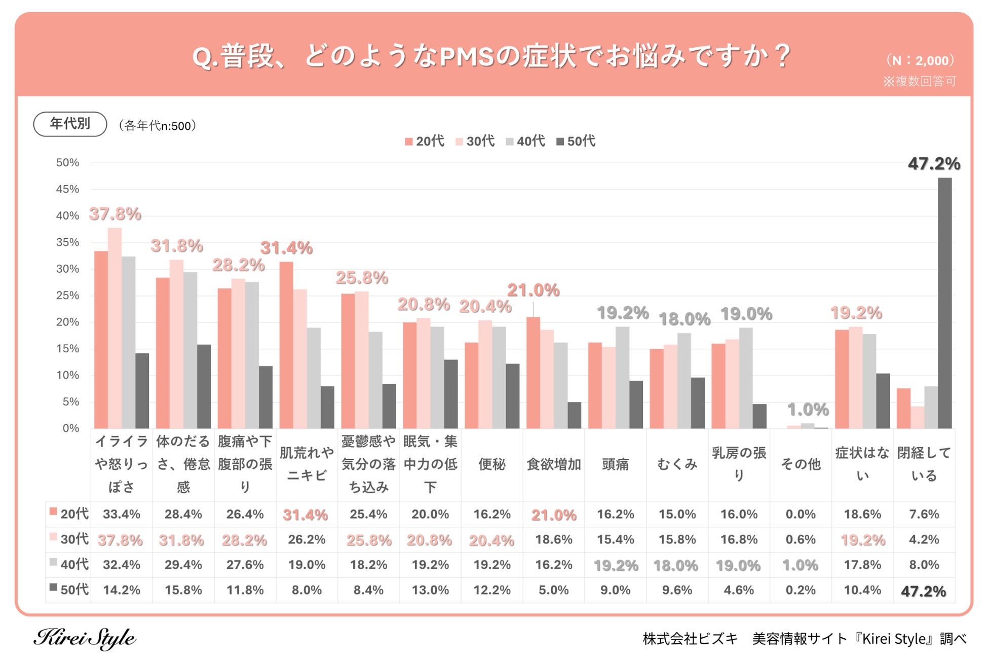 「今のキレイも、10年後の輝きも」をコンセプトに美容や健康にまつわる情報を発信する「Kirei Style(キレイスタイル)」の運用を行う株式会社ビズキは、全国の女性2,000人を対象にPMSに関するアンケートを実施し、年代別等の特徴についてまとめました。
