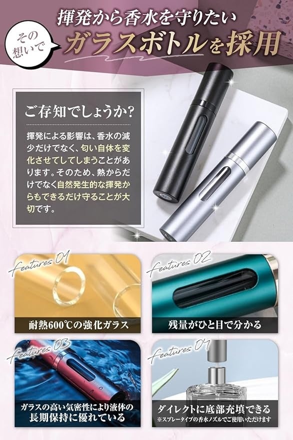 アトマイザーの底部から直接香水を充填できる設計で、手間をかけず簡単に補充が可能。忙しい朝でも、スムーズに香水を補充していただけます。