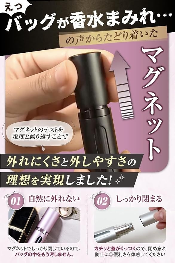 最大の特徴は閉めやすく、外れにくいマグネットキャップを採用していることです。これにより、キャップが外れてバッグの中で香水が漏れてしまう心配がなくなりました。