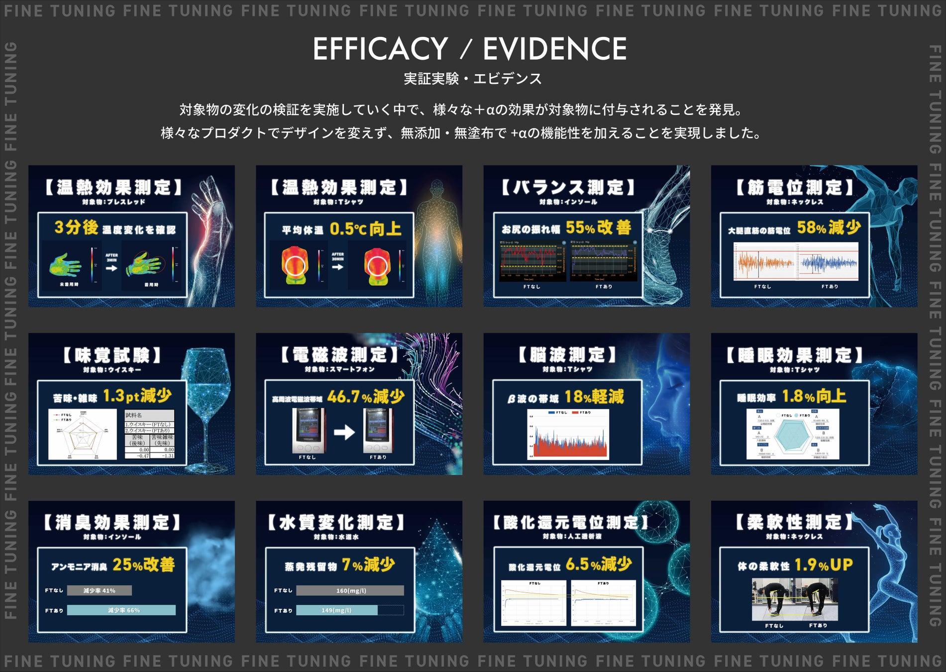 FINE TUNING技術の効果は、第三者研究機関との連携により実証されており、そのエビデンスデータを展示ブースにて公開いたします。実際の数値やデータを基に技術の効果をご確認いただけます。