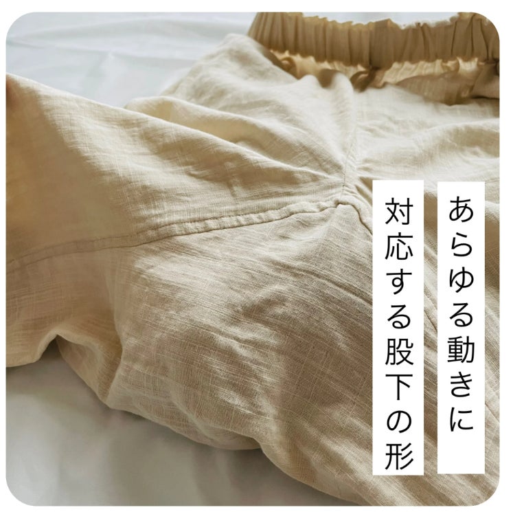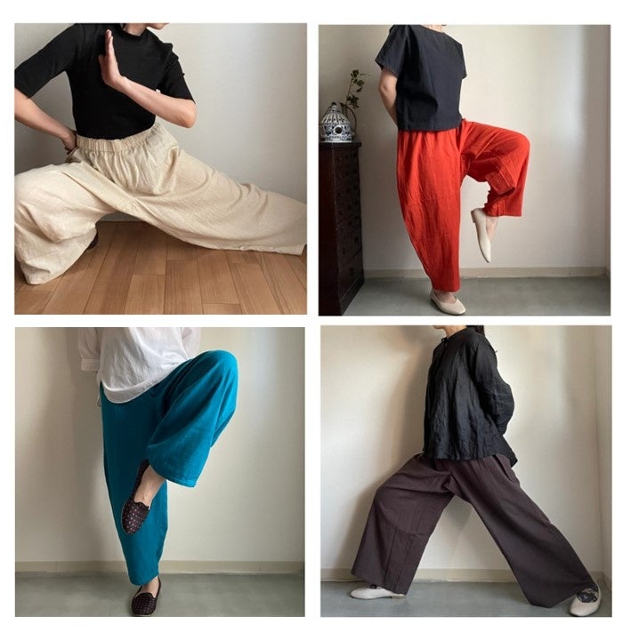 股下を立体構造にしたことで、ワイドパンツでありながら横に広がり過ぎず、袴のような凛としたシルエットを実現。特徴的な股下も一見すると分からないのも普段着として着やすいデザイン。日常の延長で青空太極拳を楽しむ愛好者や、武道ファンの日常着としてもこだわりが光るデザイン。