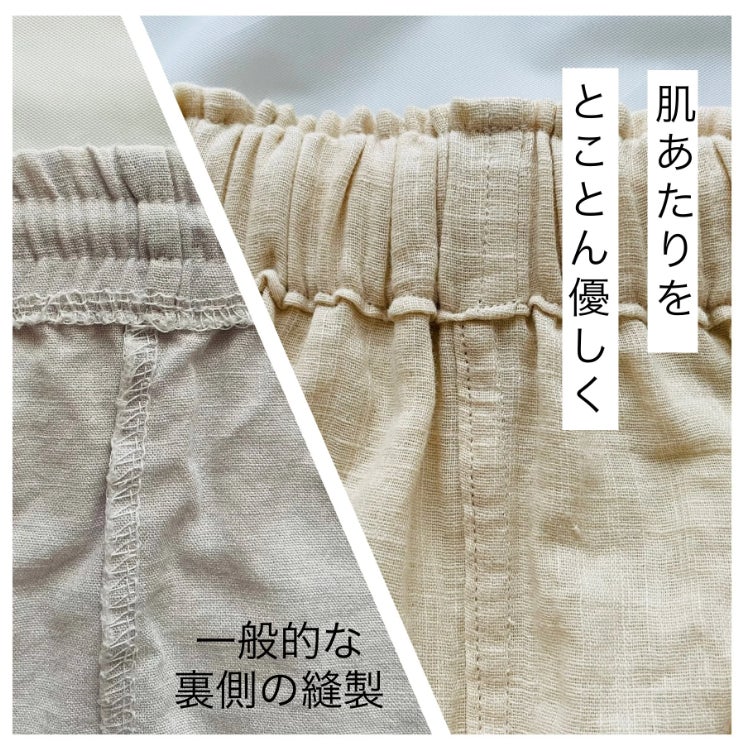 しかし、ただ天然素材に変えただけでは問題は解決せず、ロックミシンの縫製糸がかゆみの原因であることが分かり、縫製方法を研究。速乾吸湿性をもつ国産ダブルガーゼを使用し、赤ちゃんの肌着にも負けない最大限の優しさを実現した。