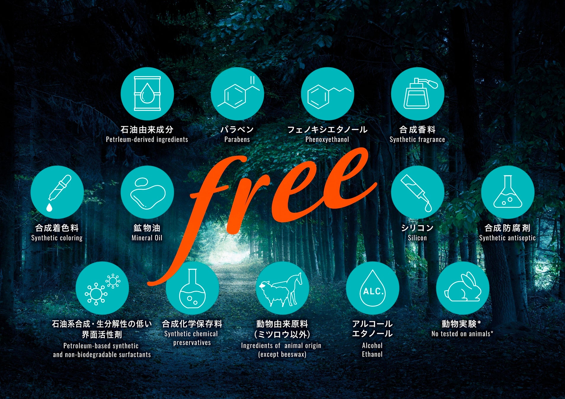 100%日本産の竹から抽出したCNF(セルロースナノファイバー)をメイン成分として配合しました。CNFの魅力をいち早く見い出し、原料会社、化粧品製造会社と共におよそ2年の歳月をかけて高濃度*の配合に成功。廃棄される植物を再利用した植物エキスを追加し、石油系合成成分などを使用しない12のケミカルフリーとアニマルフレンドリー(配合しない成分と動物を使った実験をしない)と、機能性があり自然由来指数99.7%(ISO 16128準拠)の成分処方を実現しました。
