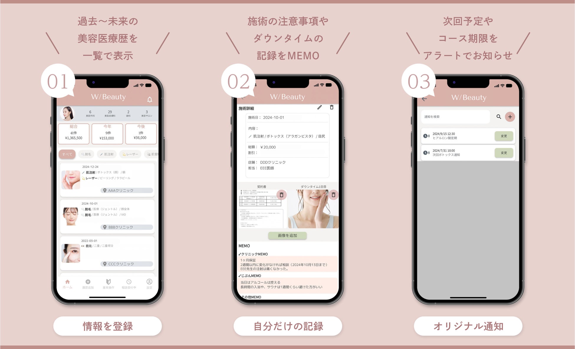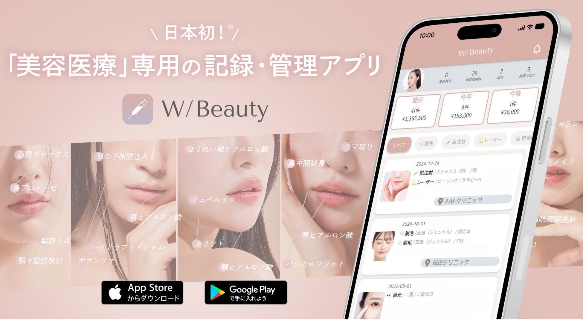 美容医療ユーザーの声から生まれた『W/Beauty』は、日本初となる美容医療歴の記録と全国のクリニック・医師リストが一つになった美容医療専用のアプリです。過去の施術履歴や今後の予定、費用、施術内容・経過観察の詳細まで、テキストと画像で一元管理でき、より充実した美容医療体験をサポートします。