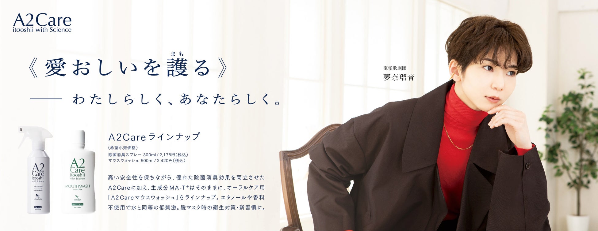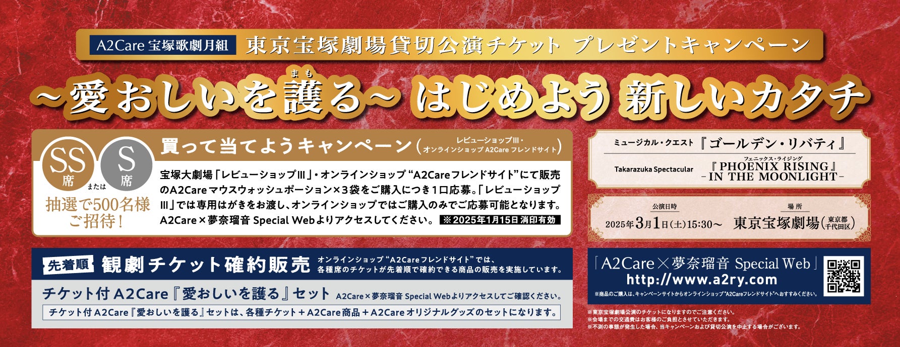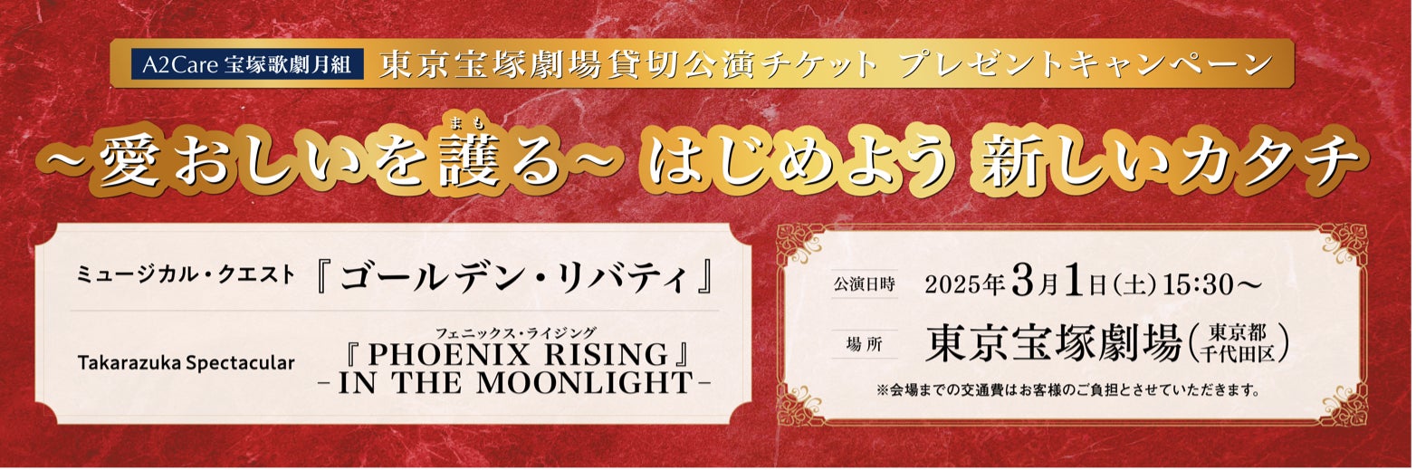 エーツーケア株式会社(本社:東京都港区、代表取締役社長:石原 嘉文)は、A2Careご愛用の感謝を込め、2025年3月1日(土)15時30分 東京宝塚劇場(東京都千代田区)にて公演される、宝塚歌劇月組公演 ミュージカル・クエスト『ゴールデン・リバティ』/Takarazuka Spectacular『PHOENIX RISING』-IN THE MOONLIGHT-のA2Care貸切公演《愛おしいを護る》キャンペーンを2024年11月15日(金)よりスタートいたします。