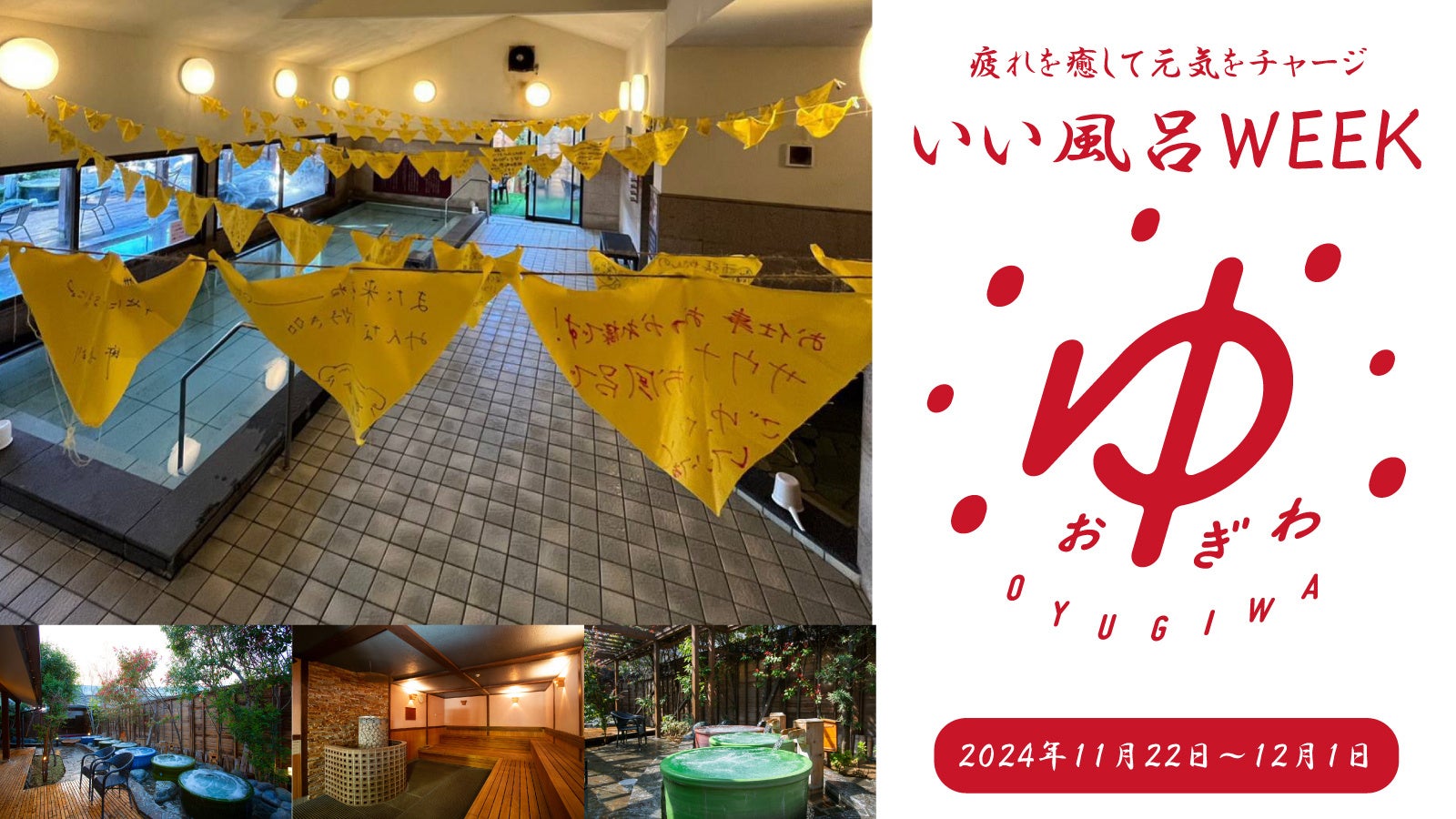 株式会社イオンファンタジー(本社:千葉県千葉市、代表取締役社長:藤原徳也、以下、当社)が運営する温浴施設「OYUGIWA 海老名」、「OYUGIWA 浜松市野」は、11月26日「いい風呂の日」にちなみ、みなさまの疲れを癒し元気をチャージしていただくために、11月22日(金)から12月1日(日)までの期間、OYUGIWA各店で『いい風呂WEEK』を開催します。開催期間中は、毎年恒例の「感謝の黄色いハンカチ」の掲示や、熱波師によるアウフグースを開催いたします。