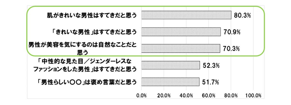 「肌がきれいな男性はすてきだと思う」と回答した割合が8割に達し、「『きれいな男性』はすてきだと思う」「男性が美容を気にするのは自然なことだと思う」は7割を超える。