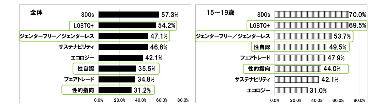 サステナビリティに関するキーワード認知率は、全体・15~19歳いずれも1位「SDGs」、2位「LGBTQ+」で、特に15~19歳では約7割。また、「ジェンダーフリー/ジェンダーレス」「性自認」「性的指向」など、性の多様性に関するキーワードも15~19歳のほうが全体に比べて高い傾向が見られる。