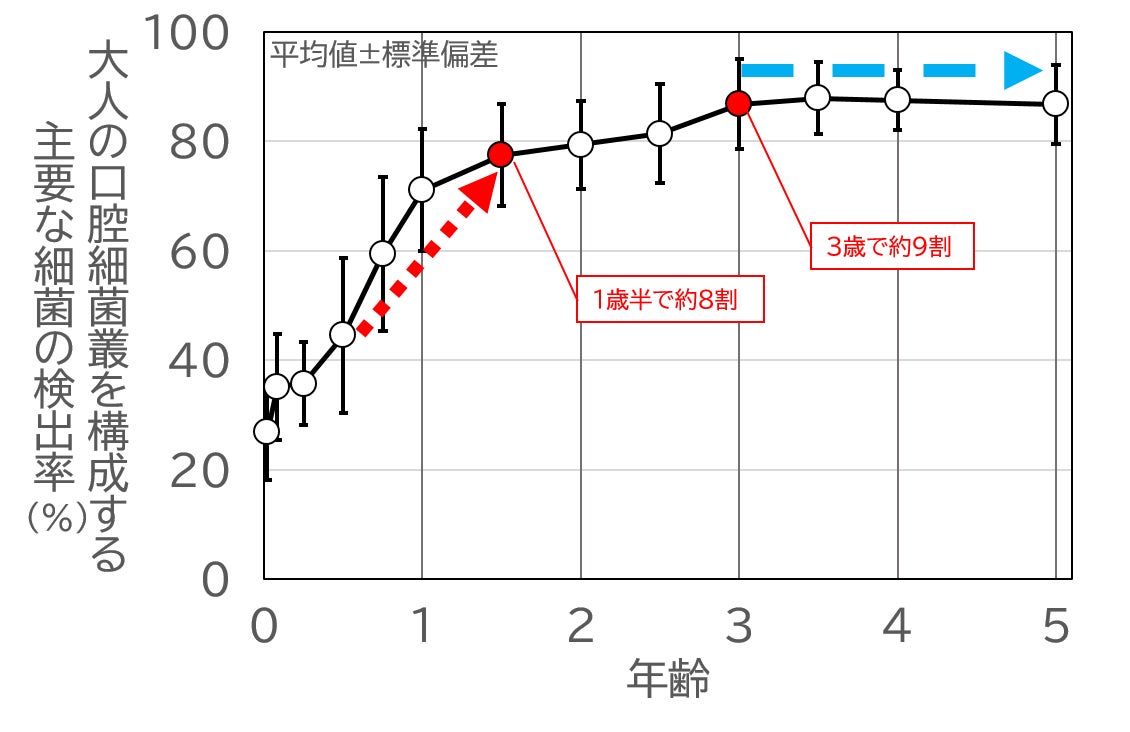 大人の口腔細菌叢を構成する主要な菌種のうち、約8割が1歳半で、約9割が3歳で検出された。