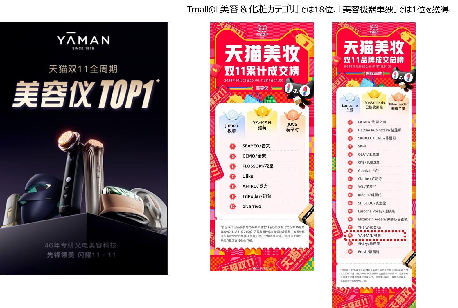 「美しくを、変えていく。」をスローガンに掲げ、技術の力でグローバルに美の進化に挑み続ける5年連続美顔器シェアNO.1*2のヤーマン株式会社(所在地:東京都江東区、代表取締役社長:山﨑貴三代)は、世界最大規模のネットセールス期間として知られる11月11日「独身の日」において、中国最大の総合ECプラットフォーム「Tmall」内の美容機器部門の販売実績で1位*1を獲得、「美容&化粧カテゴリ」総合ランキングでは美容機器ブランドとして唯一、グローバルラグジュアリーコスメ・スキンケアブランドなどと肩を並べTOP20*1にランクインいたしました。