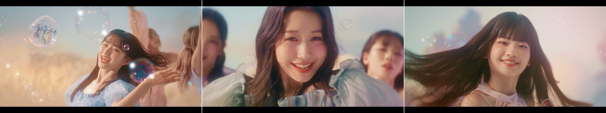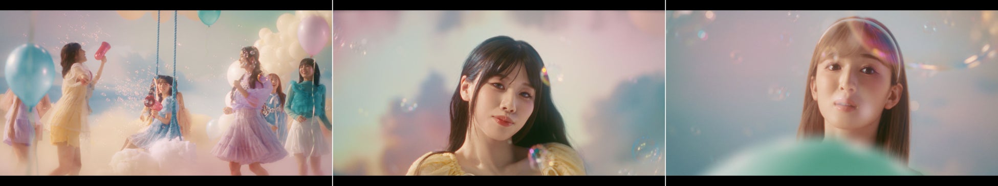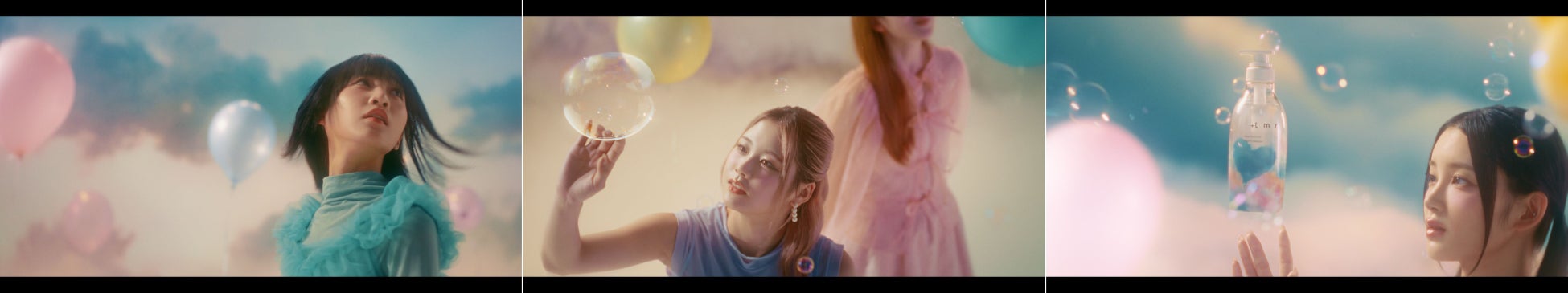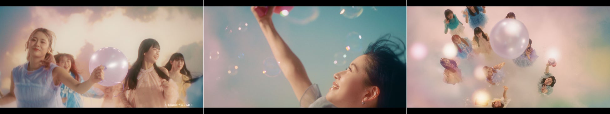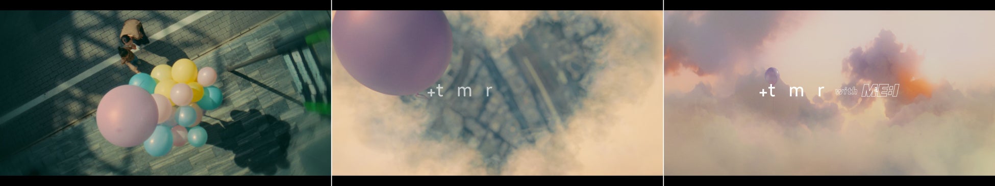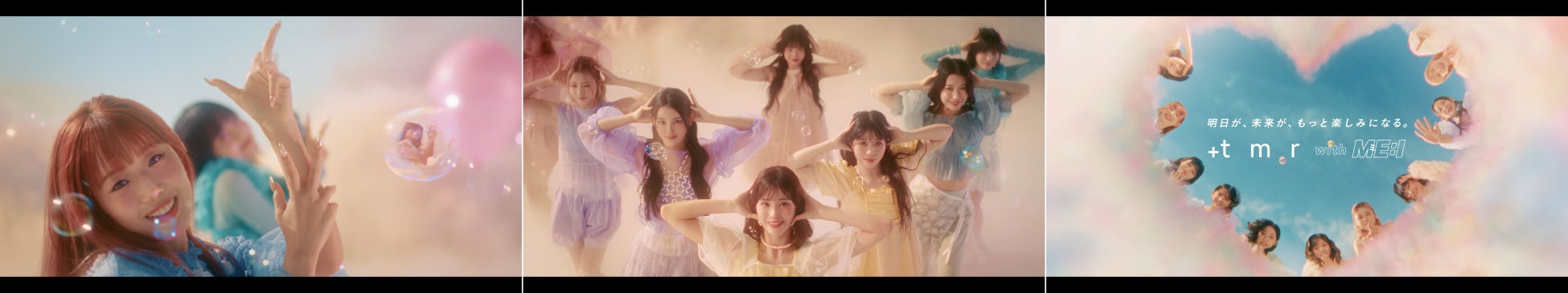 世界中どこからでも、空を見上げれば物語は始まる。風船に導かれ、ハートの雲間を抜けた先に待っているのは明日への希望に彩られた彩雲の世界。バブルガンや風船を手に笑顔で駆け出すME:Iのメンバーたち。まるで明日を映し出すかのような輝くシャボン玉に触れたり、風にのって明日へと一緒にふわふわ飛んで行けそうな風船とたわむれたり、ブランコに乗ったりと、おのおのが楽しむシーンの後には、全員で“髪”をなびかせながら軽やかにダンスを踊ります。最後のシーンでは、見上げた先にあるハートの雲間からME:Iメンバーの笑い声が聞こえてくると、笑顔のメンバーたちが雲間をのぞき込み、【明日が、未来が、もっと楽しみになる。】という想いをのせて、「+tmr with ME:I」のエールを送るかのような掛け声で締めくくられています。