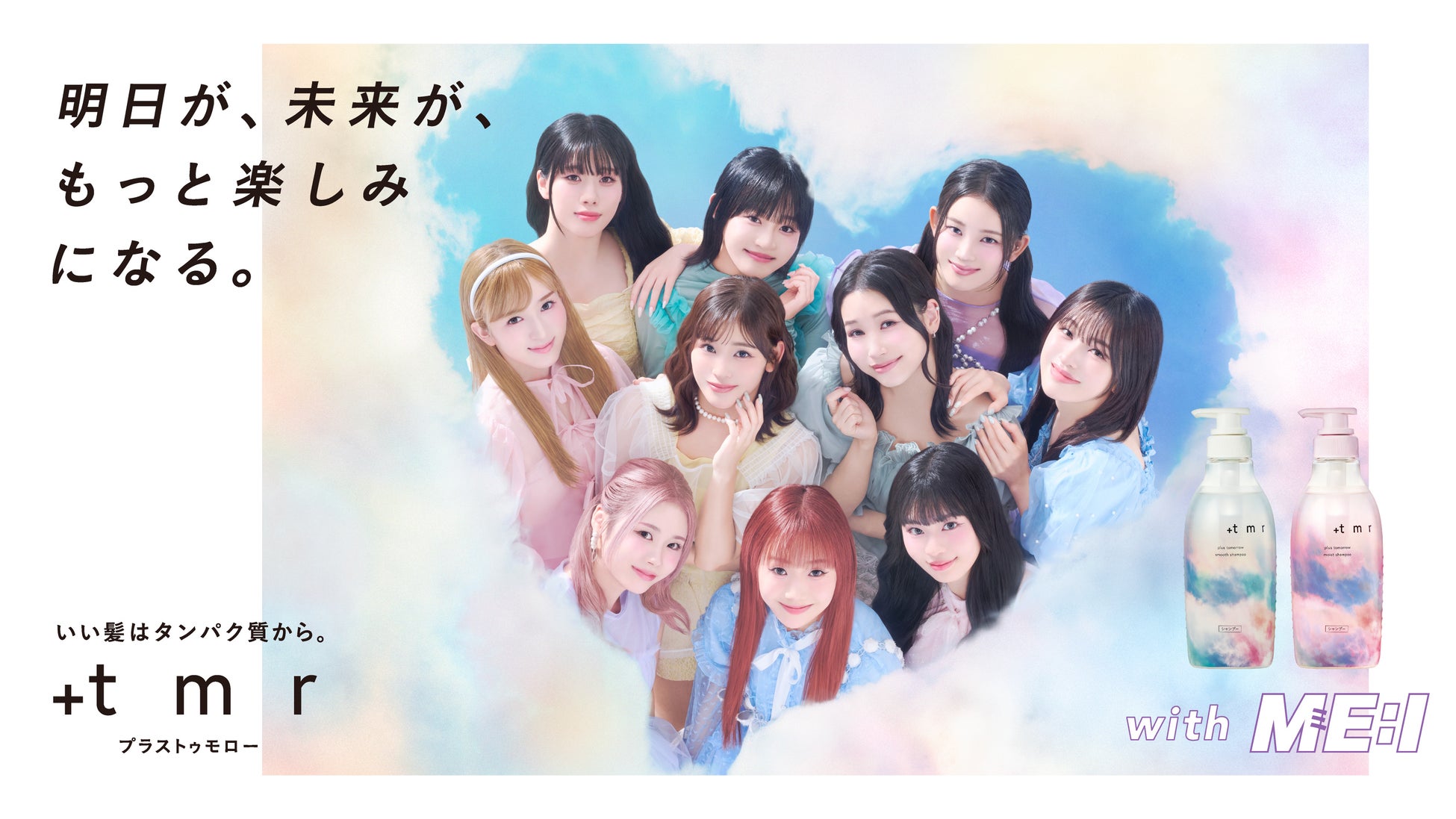 2024年2月の発売以来、一貫して“髪の主成分であるタンパク質に着目した髪の本質ケア”を提案し、生活者の皆さまの今日、そして明日を「髪も、気持ちまでも、少しずつ晴れやかに」できるブランドを目指してきた「+tmr」と、等身大の自分に向き合い、1歩ずつ未来を変えていく未来のアイドル「ME:I」。グループ名には、「ME=新しい未来」「I=愛・アイドル」という想いが込められています。両者の想いを重ねることで描き出されていく明日、そして明日が積み重なっていく未来。今回のコラボレーションを通して、皆さまの【明日が、未来が、もっと楽しみになる。】、そんな気持ちになれるお手伝いをしてまいります。