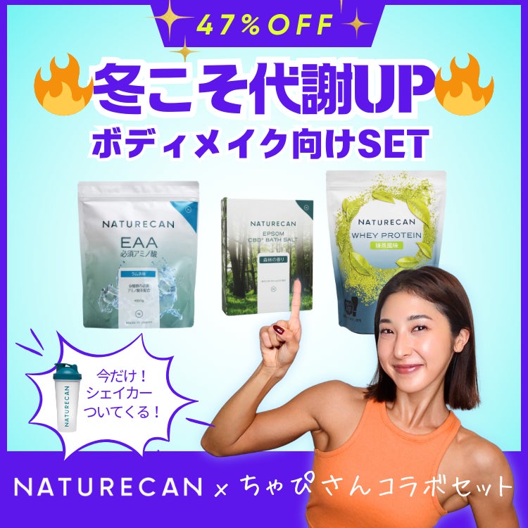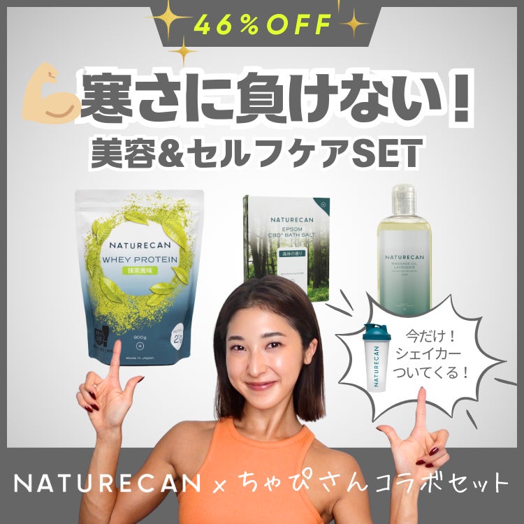 さらに、ちゃぴさんコラボ企画 『寒さに負けない! 美容&セルフケアSET』 / 『冬こそ代謝UP ボディメイクセット』のいずれかをお買い求めいただくと、購入セット数に応じてプロテインシェイカーをプレゼント!