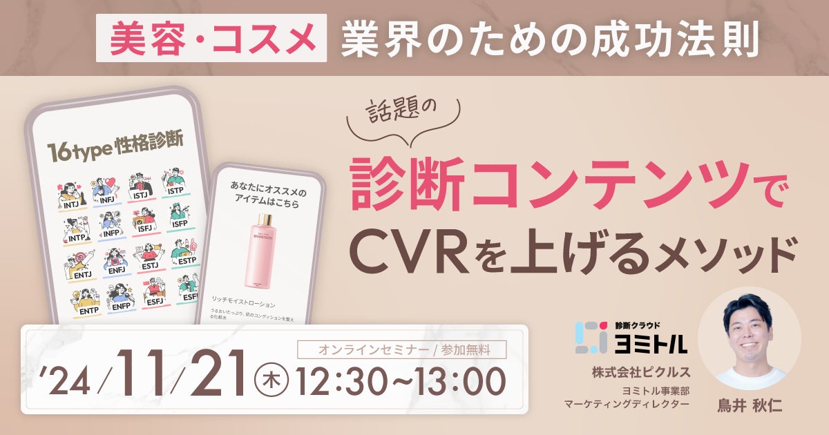 株式会社ピクルス(本社:東京都新宿区、代表取締役社長:田中 稔、以下「ピクルス」)は、2024年11月21日(木)、オンラインセミナー「美容・コスメ業界のための成功法則 話題の診断コンテンツでCVRを上げるメソッド」を開催します。