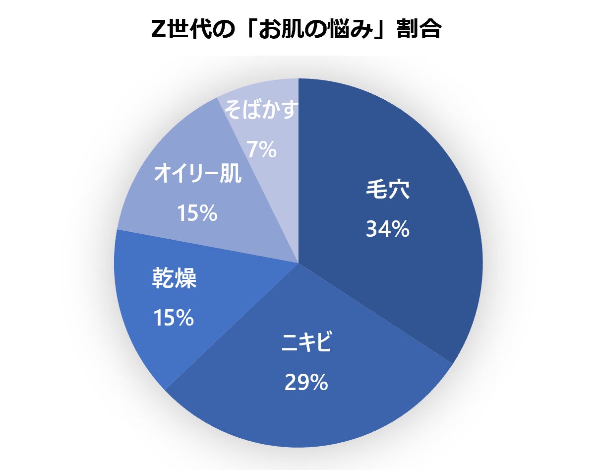 お肌の悩みで上位2番となった回答は「毛穴」と「ニキビ」でした。Z世代特有のホルモンバランスの変化により発生しやすく多くの人が悩む結果となりました。