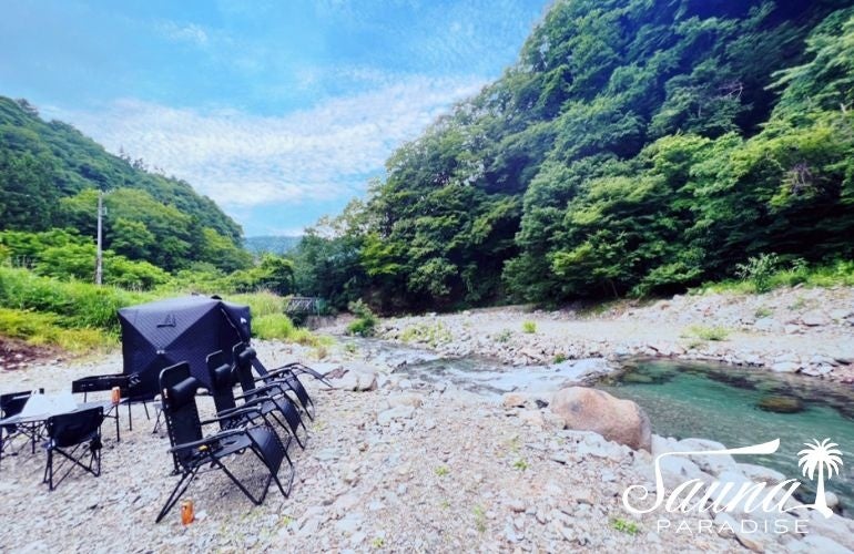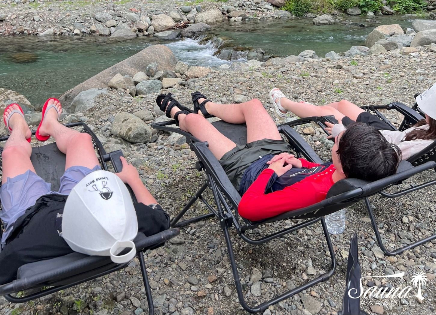 100℃以上に熱するテントサウナに蒸され天然川の水風呂へ。