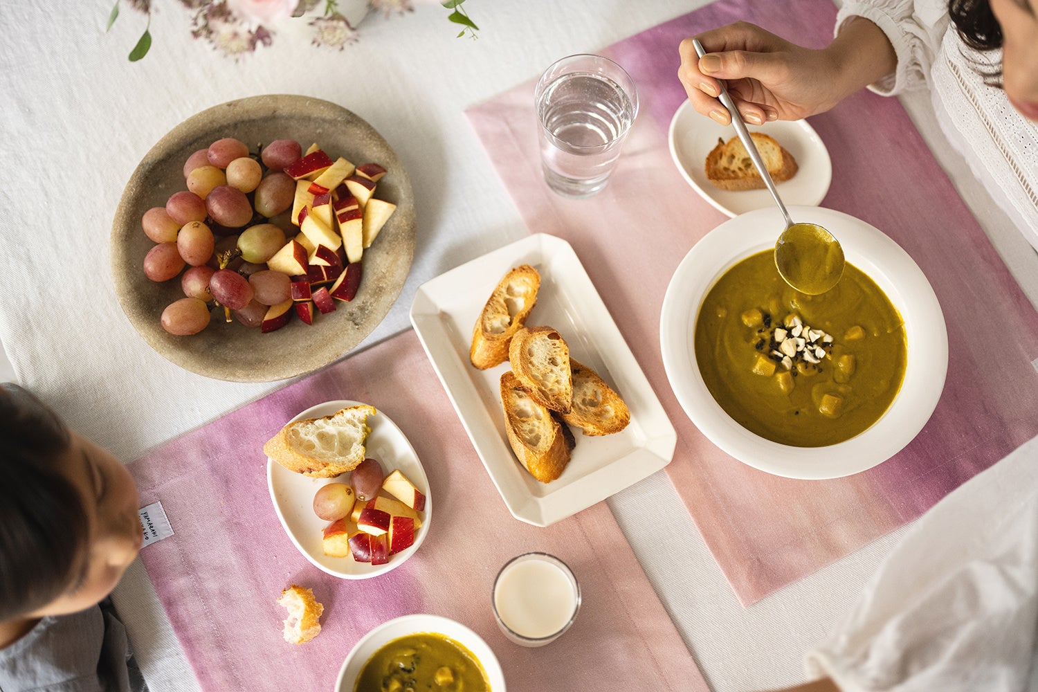 鉄分の吸収をサポートするビタミンCが豊富なさつまいもと黒ごまのポタージュ。食物繊維やマグネシウム、ミネラルが多いデーツも使用しています。豆乳の甘みやりんごの酸味が加わり、濃厚ながらも飽きのこないお味に。焼きほしいもを入れることで一口ひとくちを楽しんでいただけるスープです。