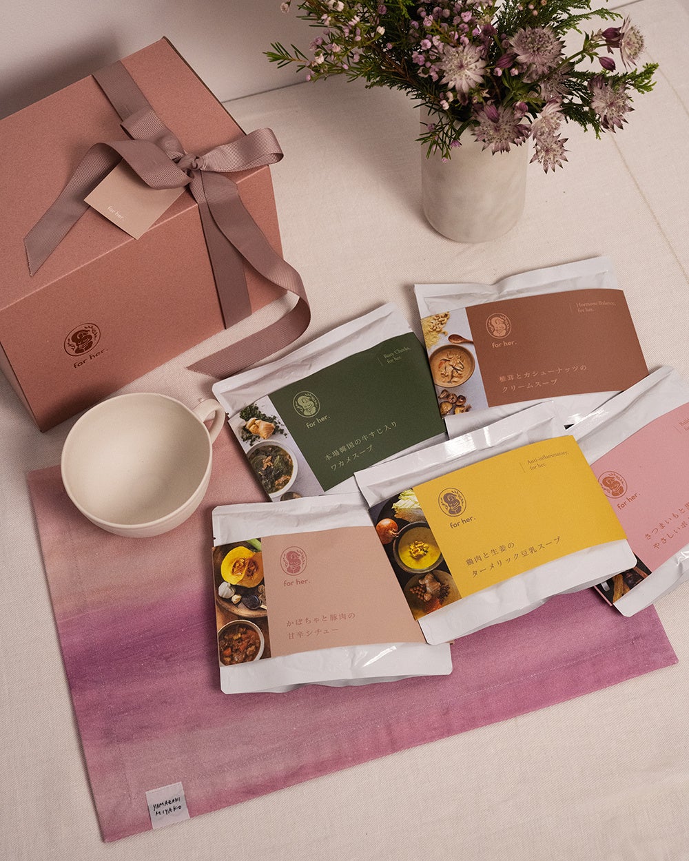 本セットは、山崎美弥子氏の絵画をデザインに取り入れたランチョンマットと、「for her.」のこだわりが詰まったスープを組み合わせた贈り物として最適な商品です。