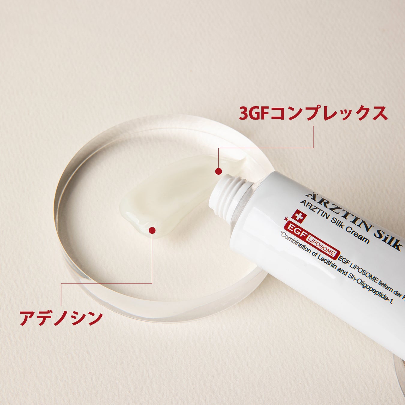 エルツティンすべてのラインアップで人気No.1*3の『シルククリーム』は、乾燥などのダメージから肌を守ってうるおいを与えるトータルマルチクリーム。ハリとツヤを与えるナノリポソーム化したEGF成分と2つのペプチド(EGF・IGF)、アデノシンやエンド豆エキス成分配合で肌にハリ・弾力を与えてすこやかなに保ちます。セラミドNPやアルガンオイル配合で肌にうるおいツヤを与え、ブラックカラントシートオイル、ビフィズス菌培養溶解質配合で荒れた肌を整え、明るいトーンへ導きます。お手入れ後はハリのあるぷるぷるななめらか肌に。敏感肌の方やお肌の弱い方でも安心して使用できます。
