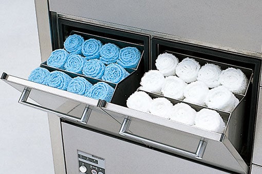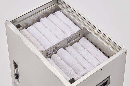 280匁の分厚いタオルを一度に約24本収納・加温が可能。庫内は気密性が高く、高温の蒸気がタオルの芯までしっかり行き届くため、清潔・安心なホットタオルを提供できます。