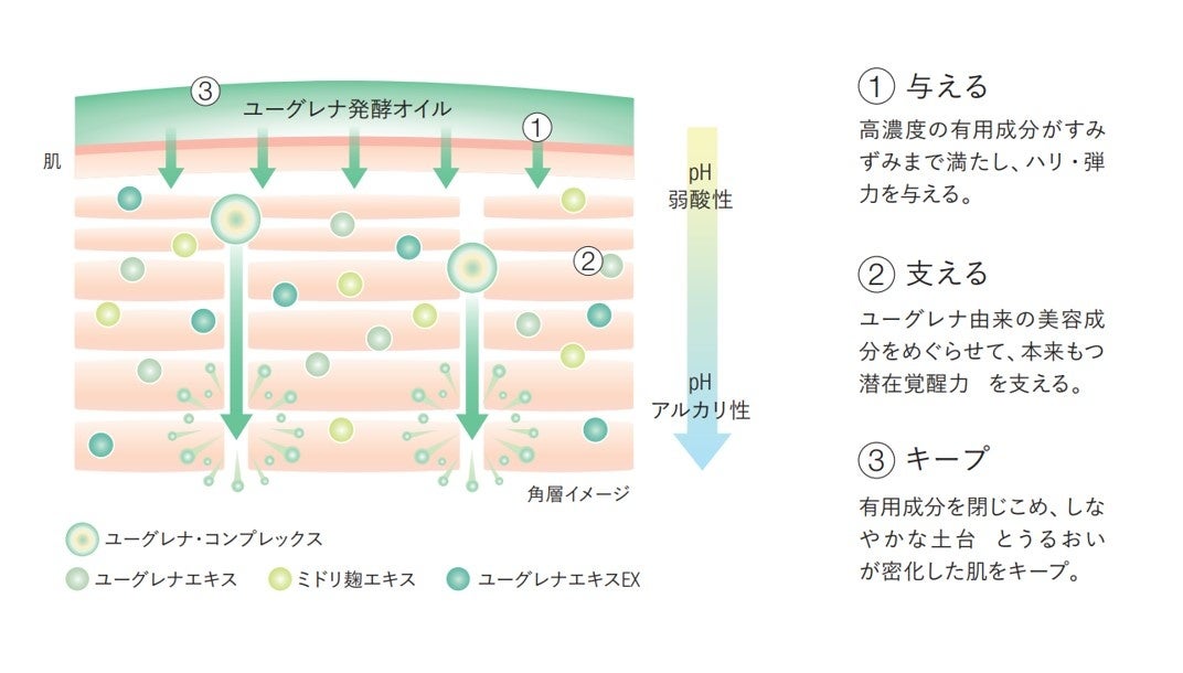 肌内部※7に浸透してアルカリ性になったところで、ユーグレナ・コンプレックス※2の5つの有用成分が放出。角層のひとつひとつまでうるおいを与え、ハリと弾力がみなぎる、ふっくらとした肌へ導きます。