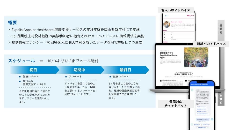 エクスポリス合同会社(本社:東京都千代田区、代表社員:松井加奈絵)は、岡山県新庄村において、AI活用型健康支援サービス「Expolis Apps for Healthcare」の実証実験を2024年10月14日より開始いたしました。
