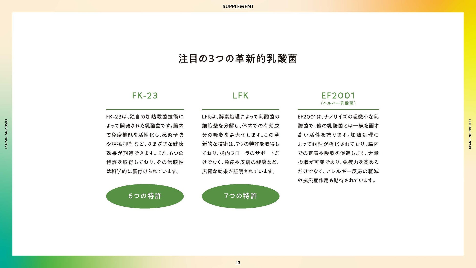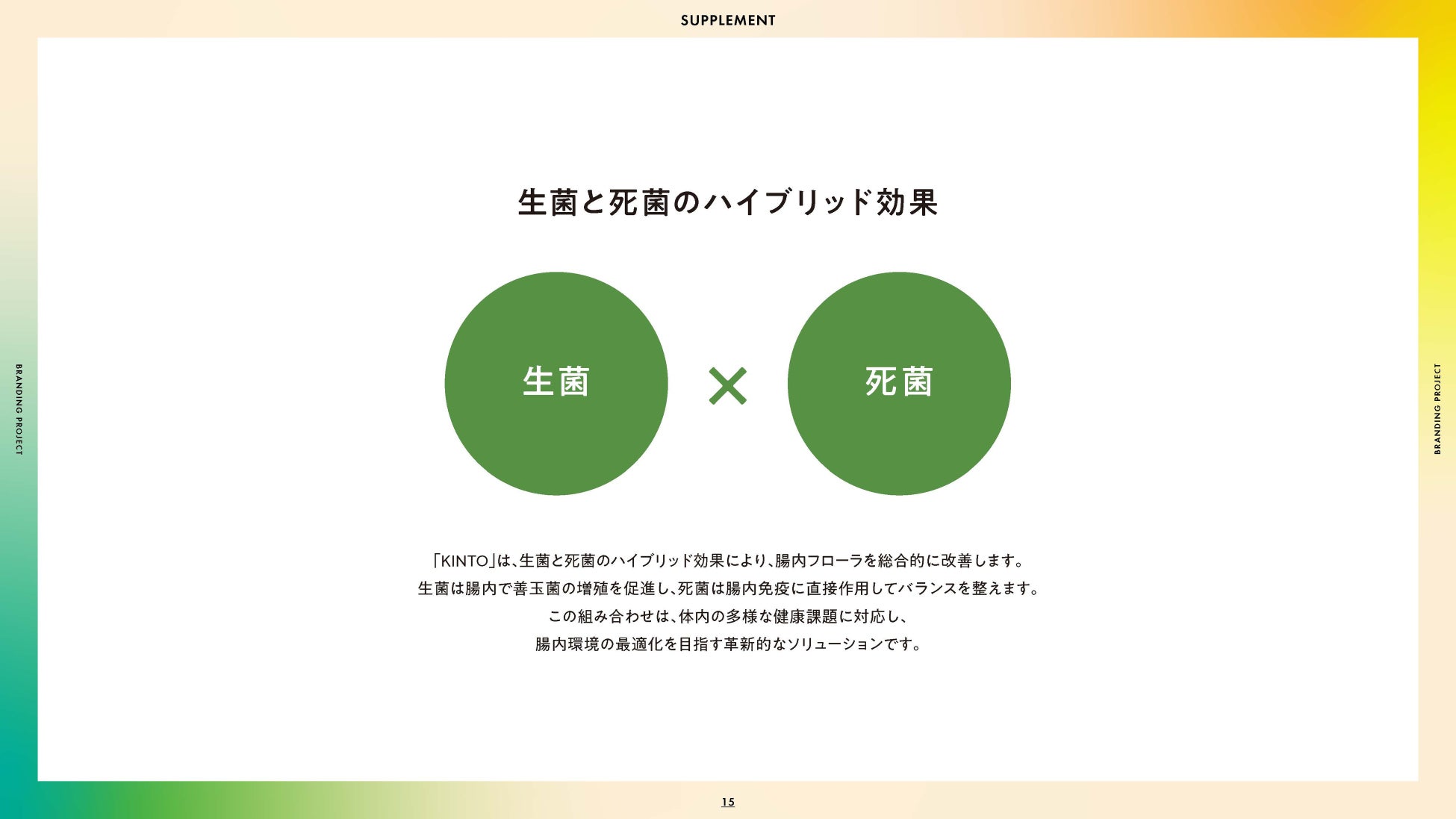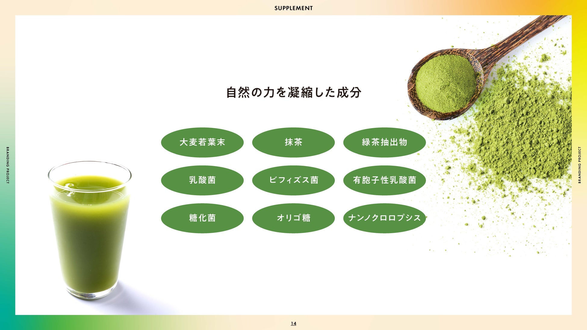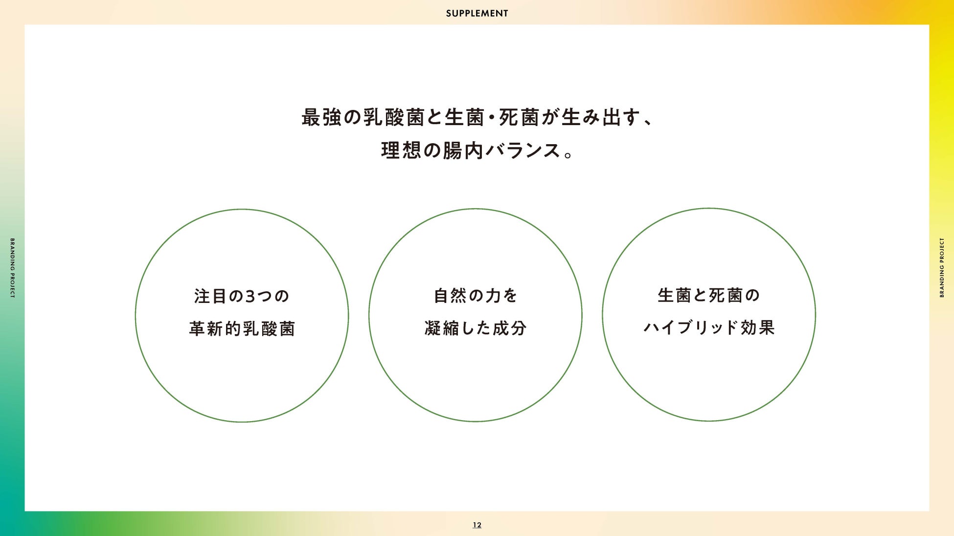 また、それぞれのサプリメントの原材料をグラデーションカラーで表現。サプリメントの成分が体の中で混ざり合い、作用をもたらすイメージと、自分が変わっ「ていく」感覚を表しています。