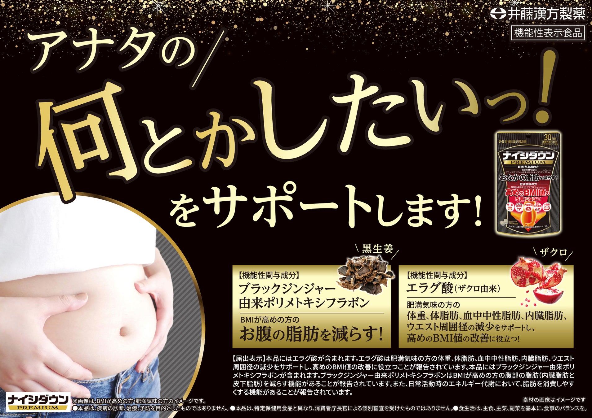 井藤漢方製薬株式会社(本社:大阪府東大阪市、代表取締役社長:井藤竜生)は、2つの機能性関与成分ブラックジンジャー由来ポリメトキシフラボンとエラグ酸を配合した商品【ナイシダウンPREMIUM】を、2024年11月18日(月)より新発売いたします。