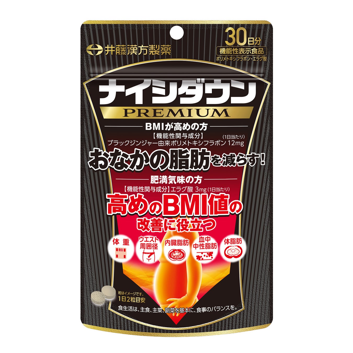 本商品は、肥満気味の方やBMIが高めの方の健康サポートを目的とした2つの機能性関与成分「ブラックジンジャー由来のポリメトキシフラボン」と「エラグ酸」を配合した、プレミアム処方の商品となります。