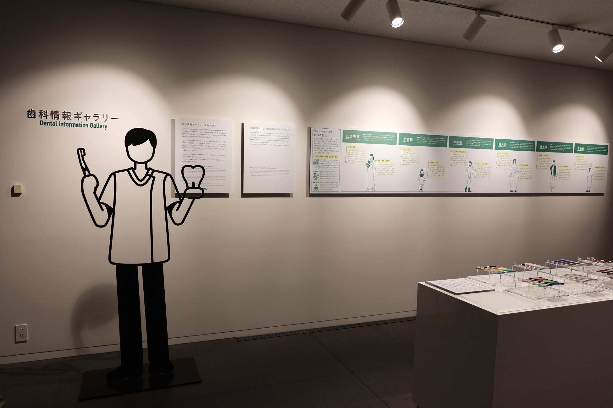 1階エントランスロビーには、「歯科情報ギャラリー」を新設いたしました。当施設は、一般の皆様にお口の健康の大切さを感じていただき、より多くの関心をもっていただくことを目的とし、ライフステージにおけるお口の変化とその対応を解説したパネルやセルフケア製品などを展示しております。この施設での経験をきっかけに、お口の健康を保っていただき、地球市民の皆様の幸せな人生の一助となることを願っております。