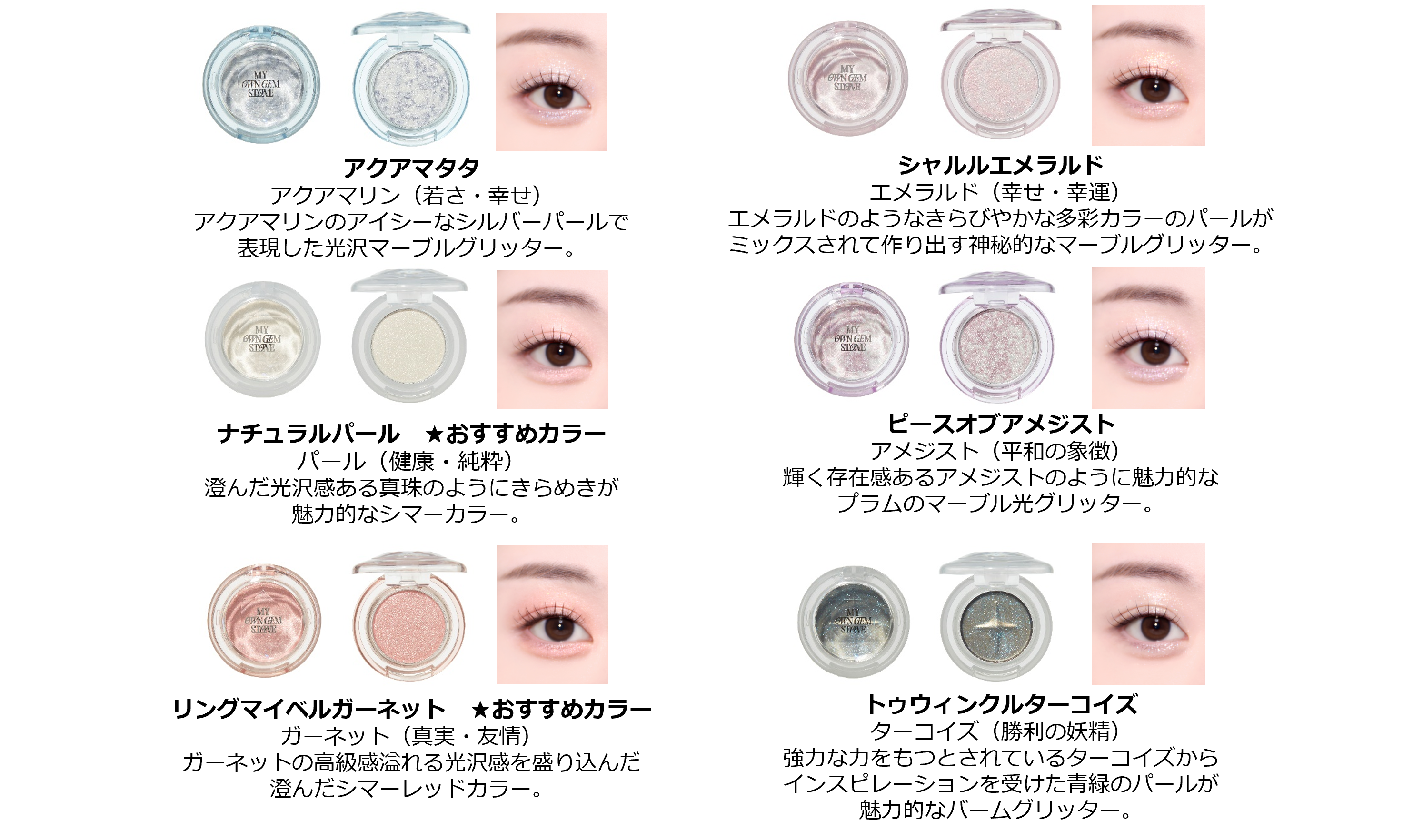 誰もが使いやすく、肌なじみのよい絶妙カラーをセットにした4色アイシャドウパレット、色ツヤや輝き満ちる目元に仕上げるマルチテクスチャーのアイシャドウ、宝石をイメージした限定パッケージのリップティントなど、透明感あふれる3種のメイクアイテムで新年を盛り上げます。