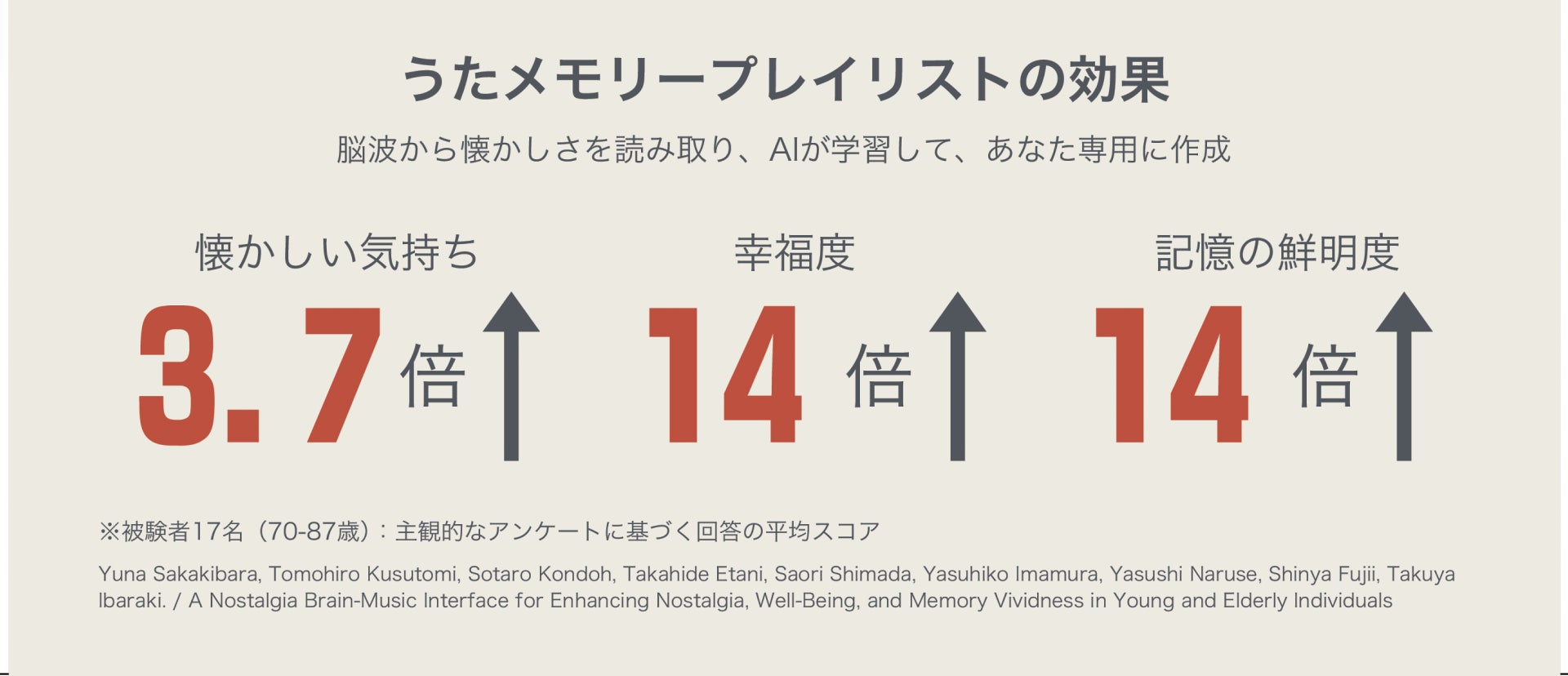 本研究により、個々の「懐かしさ」を感じやすい音楽を自動的に選定する技術が開発されました。この技術はうたメモリーに用いられており、音楽に対する懐かしさの評価、音楽の特徴、そして音楽を聞いている際の脳波データをもとに、各個人に合わせた懐かしい曲を選び出します。