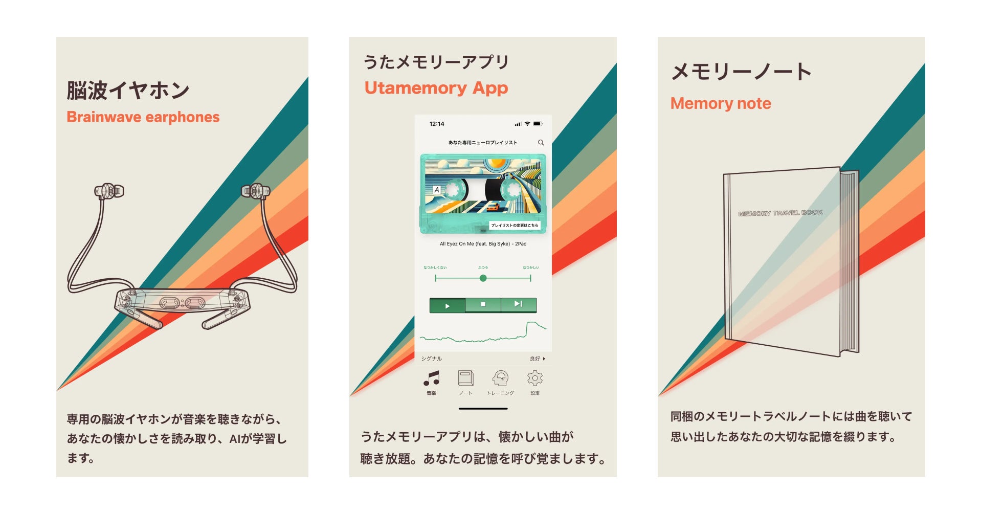 本サービスでは、脳波イヤホンを用いて自分の記憶を呼び覚ます”懐かしさ”を読み取り、AIが分析しパーソナライズされたプレイリストを作成します。懐かしい曲が聴き放題で、ユーザーの記憶を呼び覚まします。同梱のメモリートラベルノートには懐かしい曲を聴いて思い出した記憶を綴ります。