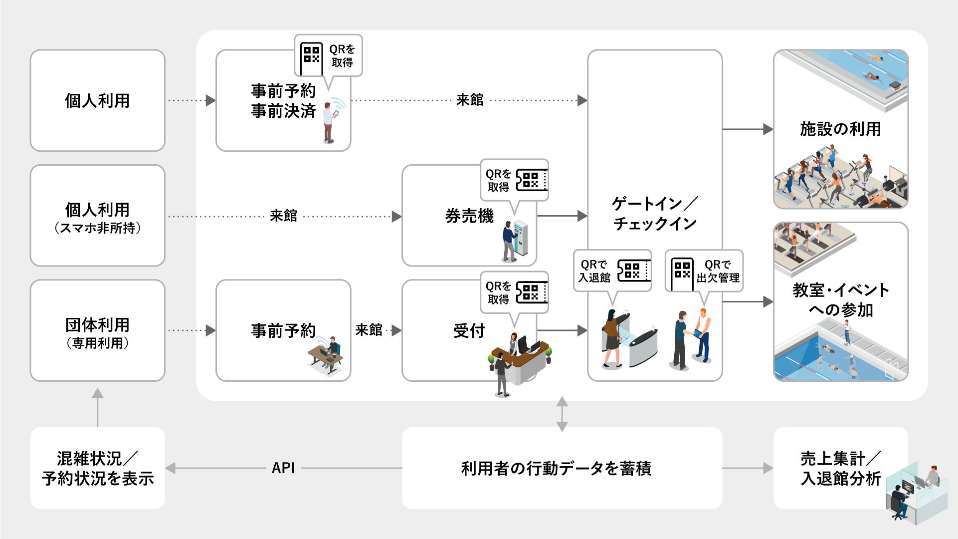 株式会社Fujitakaの券売機および入退場・セキュリティゲートシステムと連携することで、「hacomono」に表示させたQRで利用券の購入や施設への入館を実現しました。紙の利用券のように紛失や破損の心配がなく、他人への受け渡しが難しいことで不正利用も防止できます。オンライン決済により、施設側における現金管理の負担も軽減しました。