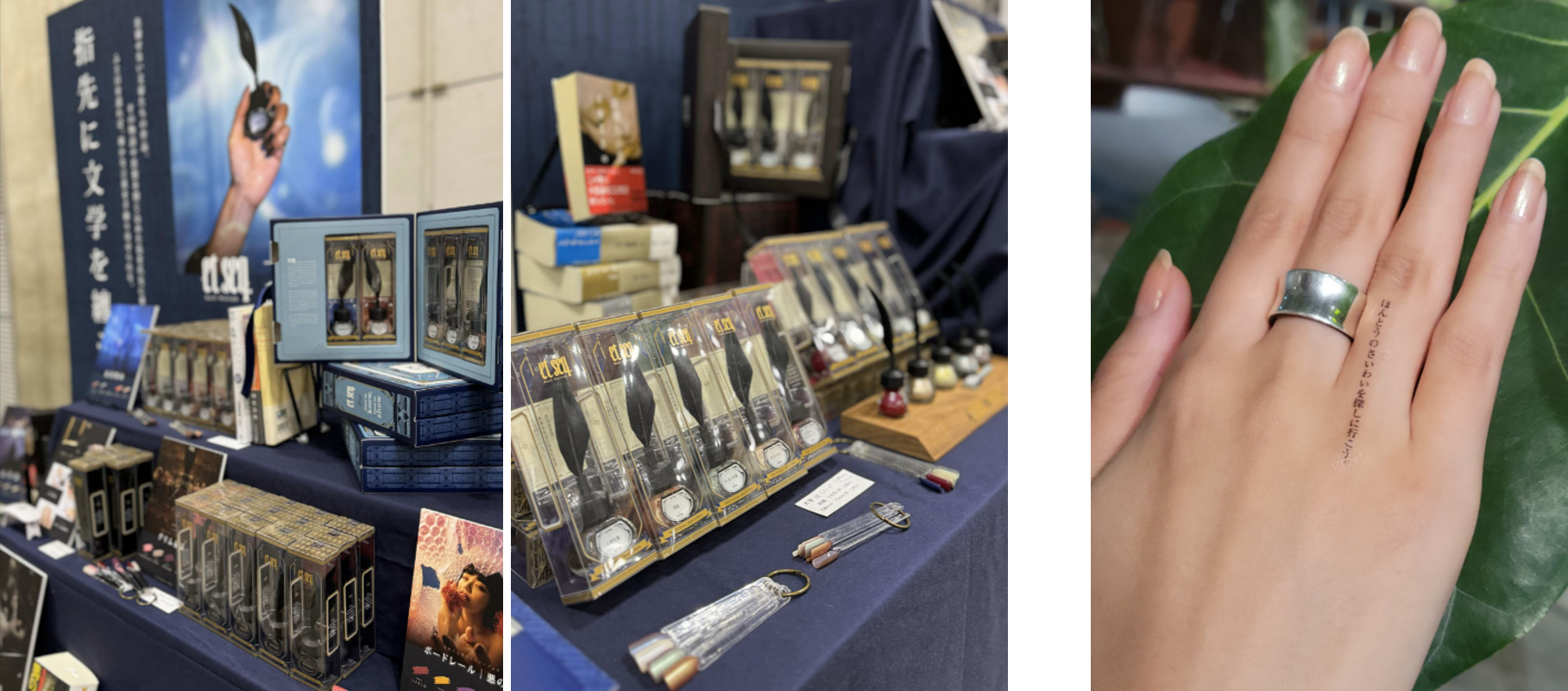 昨年に続き2度目の出店となる今回は、「文学を纏う」が台湾のネイルブランド「et seq.」と共同制作した羽根ペンネイルポリッシュ「森見登美彦」「江國香織」「京極夏彦」「太宰治」「宮沢賢治」の5シリーズ(全26商品)に加え、新商品となる「ルームミスト:銀河鉄道の夜」を数量限定で先行販売します。さらに会場限定のノベルティとして、「文学を纏う」ブースで商品を2点以上ご購入いただいたお客様に、「文学を纏う」オリジナルタトゥーシールを先着でプレゼントします。