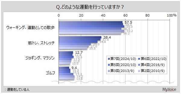 「ウォーキング・運動としての散歩」が57.5%、「筋トレ、ストレッチ」が38.4%、「ジョギング、マラソン」が12.7%です。