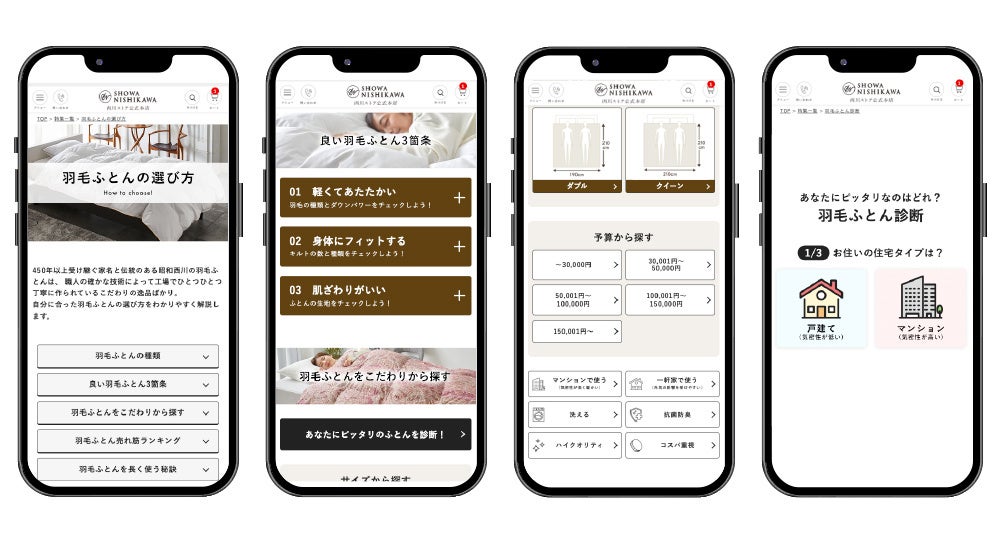 「あなたにピッタリなのはどれ?羽毛ふとん診断」など、自分に合った羽毛ふとんの選び方を