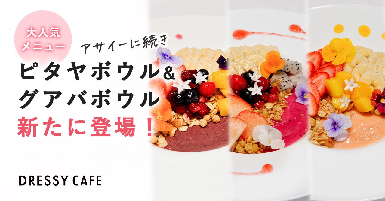 「PLACOLE&DRESSY」プロデュースカフェ DRESSY CAFEで大人気のメニュー、「お花のアサイーボウル」に続き、ボウル系メニュー、「お花のグァバボール」、そして「お花のピタヤボウル」が登場いたしました。 DRESSY CAFEでは、色とりどりの果物で美味しく美しく、栄養豊富なアサイーをベースに、ビタミン・ミネラルなどの栄養を豊富に含んだ様々なフルーツをふんだんに使用し、美と健康を考えたメニューを取り揃えております。DRESSY CAFEらしくエディブルフラワーがトッピングされ、見た目も華やかでお楽しみいただけます。 店頭では、お好みにあわせてトッピングもご用意。様々なトッピングで自分だけの味にアレンジも可能です。