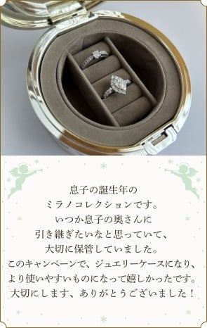 ●応募方法:お手持ちのケースが、対象となるかどうか確認の上、キャンペーンサイトよりアンケートに答えて応募。抽選で合計400名様に 『オルゴール』もしくは『コンパクト型ジュエリーケース』をプレゼントいたします。