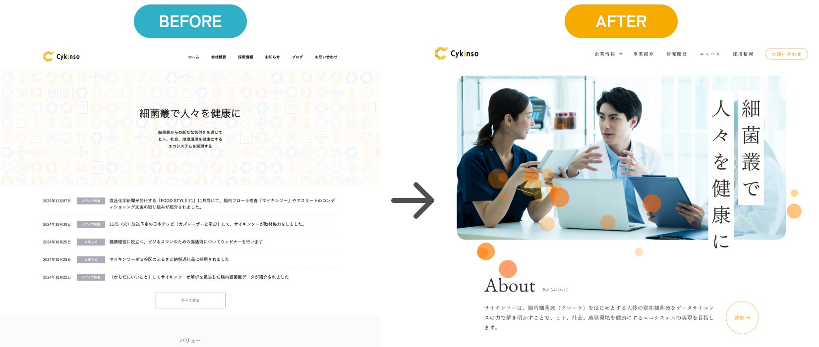 新しいコーポレートサイトでは、これまでの細菌モチーフのデザインから、多様なライフスタイルをキービジュアルに据えることで、より多くの人々の健康や生活に寄り添うことを表現したビジュアルに生まれ変わりました。さらに動きのある細菌のイメージを用いることで、変化しやすいライフスタイルと腸内フローラを表現。全体的に柔らかくも洗練された雰囲気に仕上げつつ、「細菌叢で人々を健康に」という私たちの理念を最も強く打ち出すことで、ブランドのアイデンティティを明確にしました。