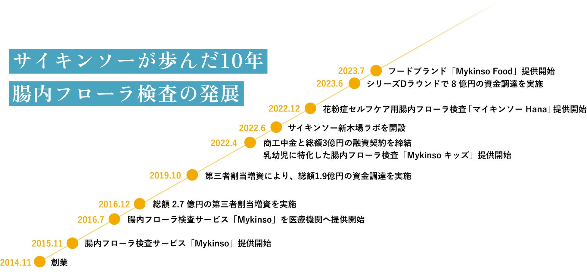 サイキンソーが創業した2014年は、「腸活」という言葉がまだ世間には馴染みがなく、腸内フローラの大きな可能性が社会には知られていない頃でした。自分の腸内フローラを知ることで、その人に合った食事や栄養素・生活習慣を提案し、誰もが簡単に健康になれる社会がつくれると確信し、サイキンソーを設立しました。そこで翌年の2015年に生まれたのが、腸内フローラ検査サービス「マイキンソー(Mykinso)」です。