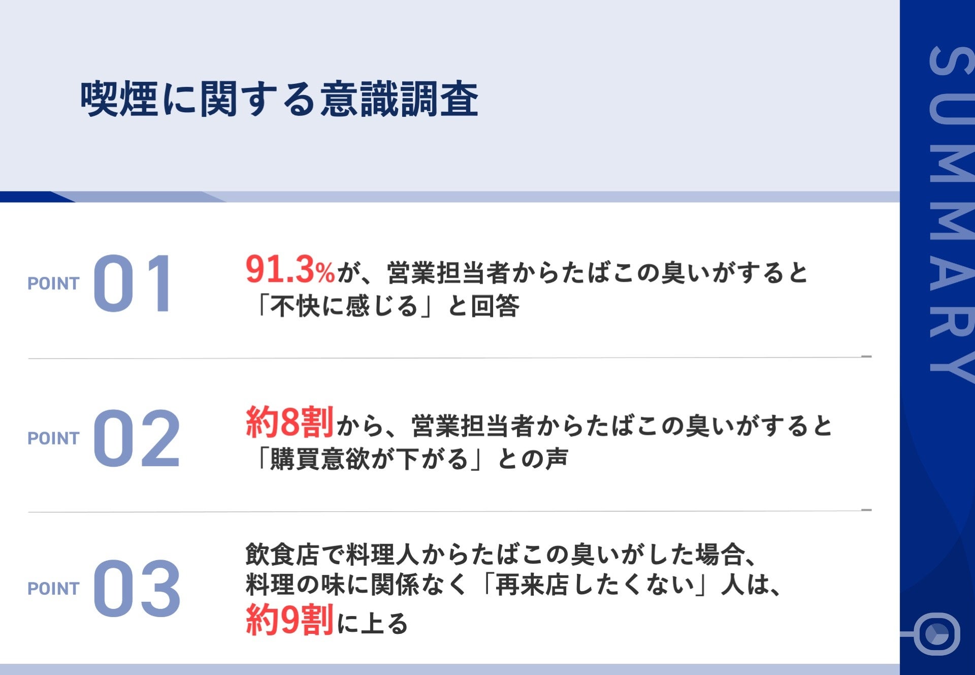 01|91.3%が、営業担当者からたばこの臭いがすると「不快に感じる」と回答